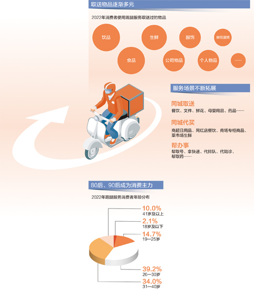 “从餐饮外卖到零售用品,再到跑腿服务,消费者对消费的时效性要求正在不断提升,而跑腿服务包括同城取送物品、同城代买和帮办事等,能够满足消费者足不出户、节约时间的需求。”达达有关负责人介绍,据测算,2022年我国即时履约配送订单量破400亿单,用户规模破7.5亿,这一趋势折射出消费者对省时省力的诉求已渐成刚需。