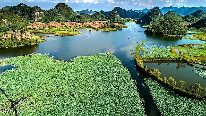 每年入夏后,普者黑景区万亩荷塘内200多个品种的野生荷花美丽绽放、壮观迷人,其中包含有红白双色并蒂莲、白色单色并蒂莲等珍稀荷花品种。随着“长江自然生态之旅”线路的开通,具有独特喀斯特地貌的普者黑景区将为中外游客提供不一样的自然生态之旅。