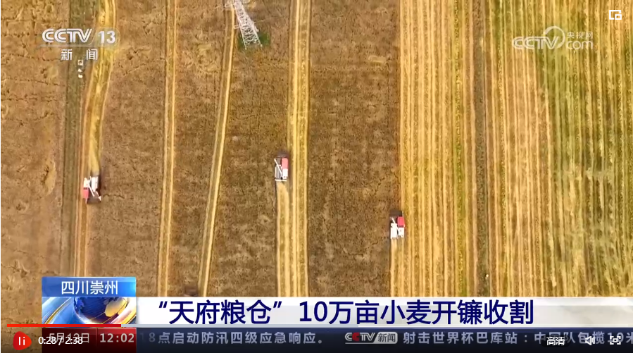 四川崇州是成都平原粮食主产区,眼下,10多万亩小麦正在开镰收割。在天府粮仓国家现代农业产业园,10台收割机在田间同时作业,收割、脱粒、除杂一气呵成,小麦秸秆也就地粉碎还田,为后续粮食作物生长提供有效的养分和有机质。