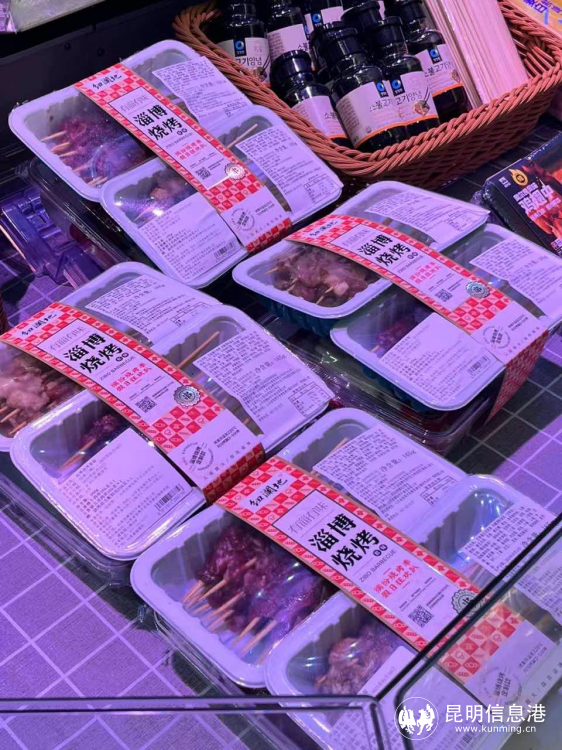 15天后,专为盒马打造的烧烤生产线,在纽澜地的数字化工厂投产:每天凌晨,刚刚屠宰的黑牛,被切成小粒,串成小串,调味腌制。数小时后,它们被装入气调包装,搭配淄博特色的小葱、小饼、烧烤料一起,坐上前往昆明的飞机,第二天一早出现在盒马门店的货架上,全程不到24小时。