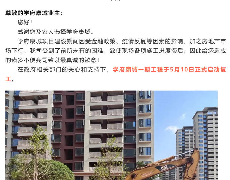 5月10日,学府康城项目“一期工程正式启动复工”。与该项目相邻不远的雍锦府项目也已获批纾困资金,预计下月开始陆续复工。