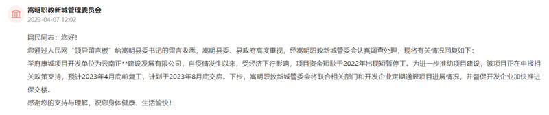 嵩明职教新城管理委员会4月7日在回复业主留言时表示:“项目计划于2023年8月底交房。”