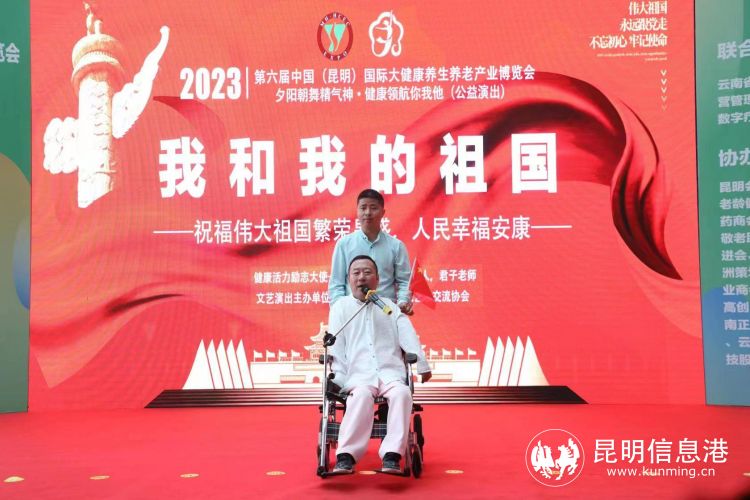 一个用轮椅代步的歌者,曾是一个被命运捉弄的人,却依靠独立和坚强改变了命运轮椅歌手-君子老师,和云南省青年男高音歌唱家张林等6位歌手带动现场嘉宾、观众手挥国旗同唱《我和我的祖国》,大家举起双臂,跟随节拍,放声歌唱,把开幕式推向了高潮。