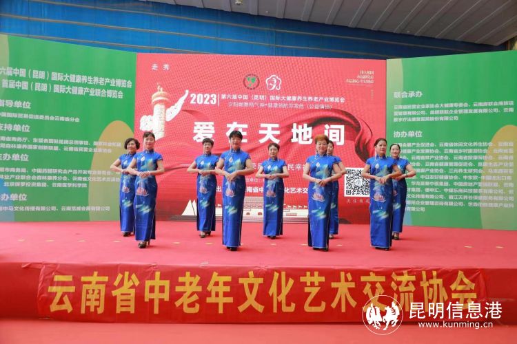 昆明信息港讯 第六届中国(昆明)国际大健康养生养老产业博览会于2023年5月12日上午在昆明滇池国际会展中心5号馆开幕。博览会协办单位云南省中老年文化艺术交流协会14支文艺团队在开幕式上举行了“夕阳朝舞精气神·健康领航你我他”公益演出,演唱的《我和我的祖国》受到参展与会者的欢迎。