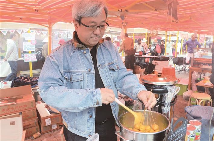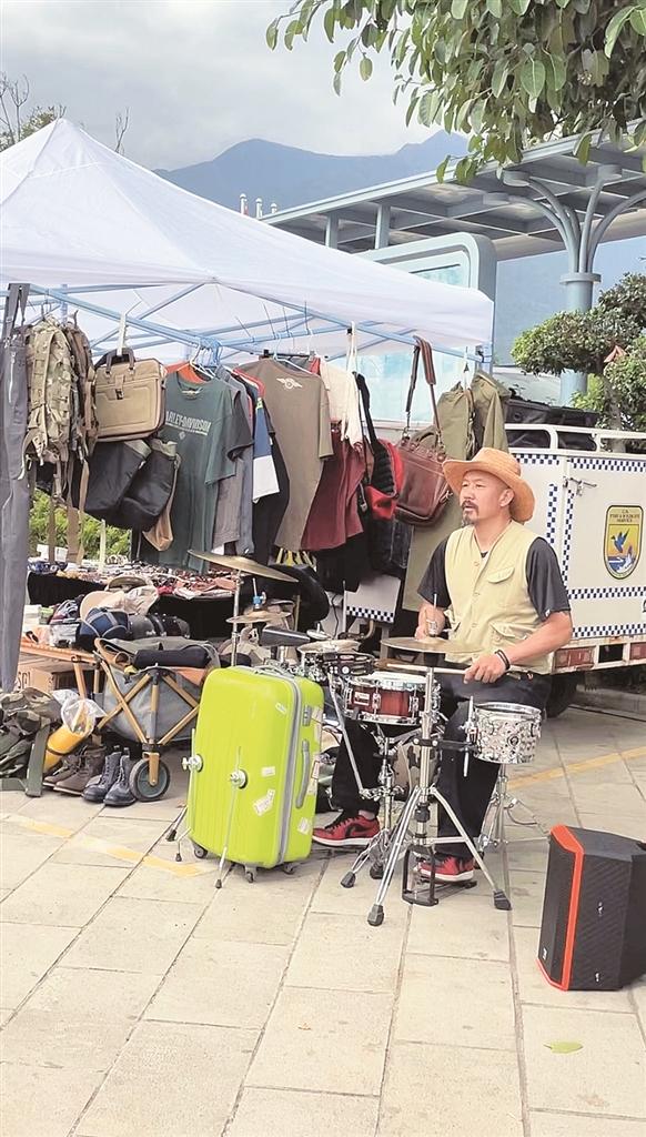 ▲ 南国城(密湾)分会场文创集市的摊主在摆摊时打起了架子鼓。