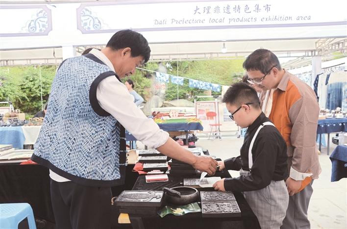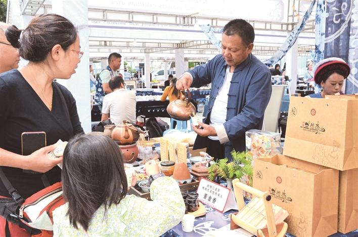南国城(密湾)分会场非遗特色集市里游客正在品尝白族三道茶。