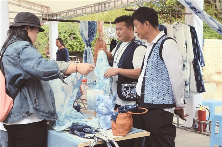 南国城(密湾)分会场非遗特色集市里摊主正在给游客介绍扎染。
