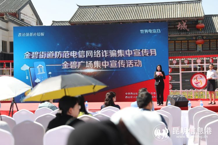 昆明信息港讯 记者张楠 5月17日,正值第54个“世界电信日”,西山区金碧街道在金碧广场举行防范电信网络诈骗集中宣传月启动仪式,呼吁广大群众了解电信网络诈骗手段,防范电信诈骗侵害,共同打造“平安西山”。