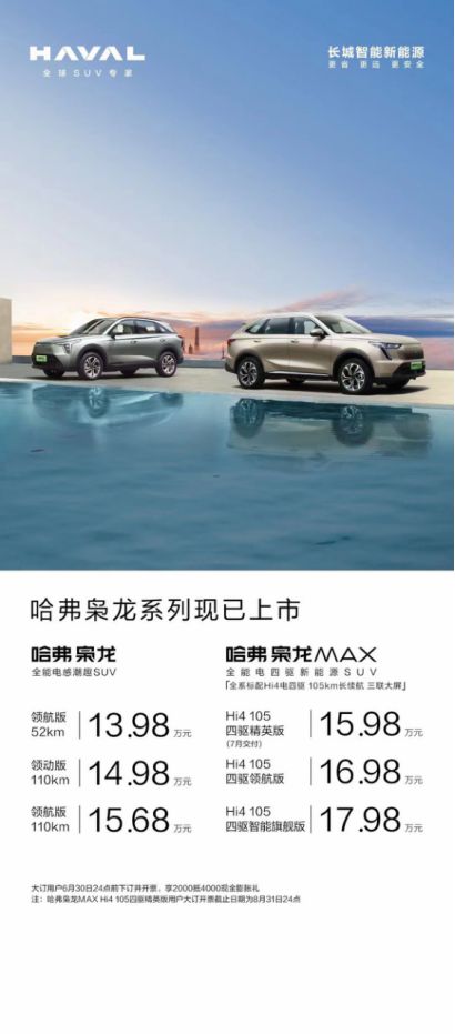 5月15日,哈弗枭龙系列正式上市,其中哈弗枭龙MAX售价15.98万元-17.98万元;哈弗枭龙售价13.98万元-15.68万元。