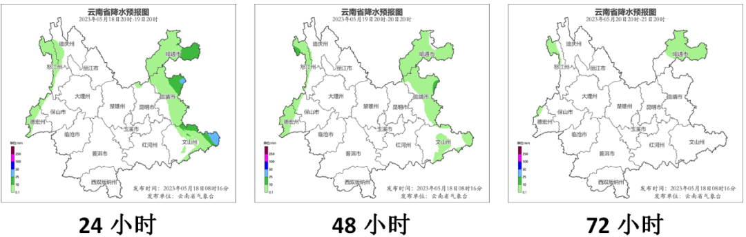 5月18日20时到5月19日20时:昭通东部、曲靖东部、文山东部阴有小到中雨局部大雨,昭通西部、迪庆西部、怒江西部、保山北部、德宏西部多云有阵雨,其它地区晴间多云。