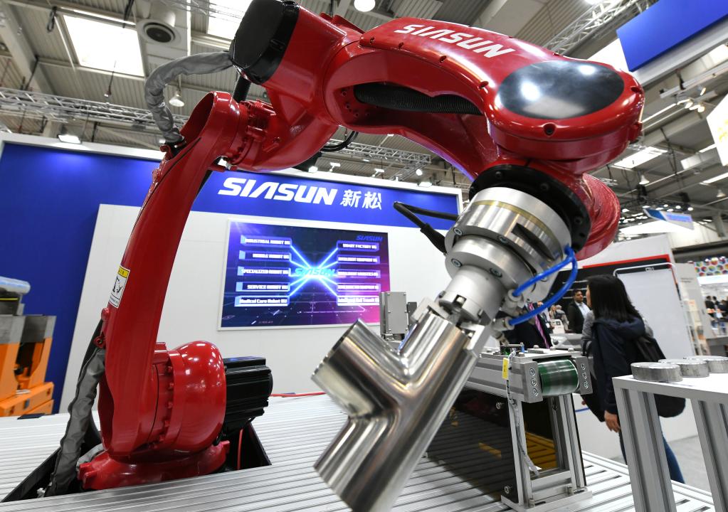 这是4月18日在汉诺威工博会上拍摄的新松工业机器人。2023年德国汉诺威工业博览会17日至21日举行,大约800家中国企业线下参展。(新华社记者任鹏飞摄)