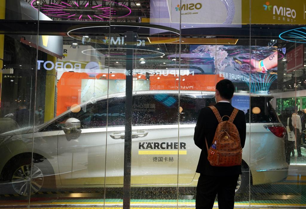 2021年11月6日,观众在第四届进博会德国卡赫展台参观全自动洗车机器人的演示。(新华社记者刘颖摄)
