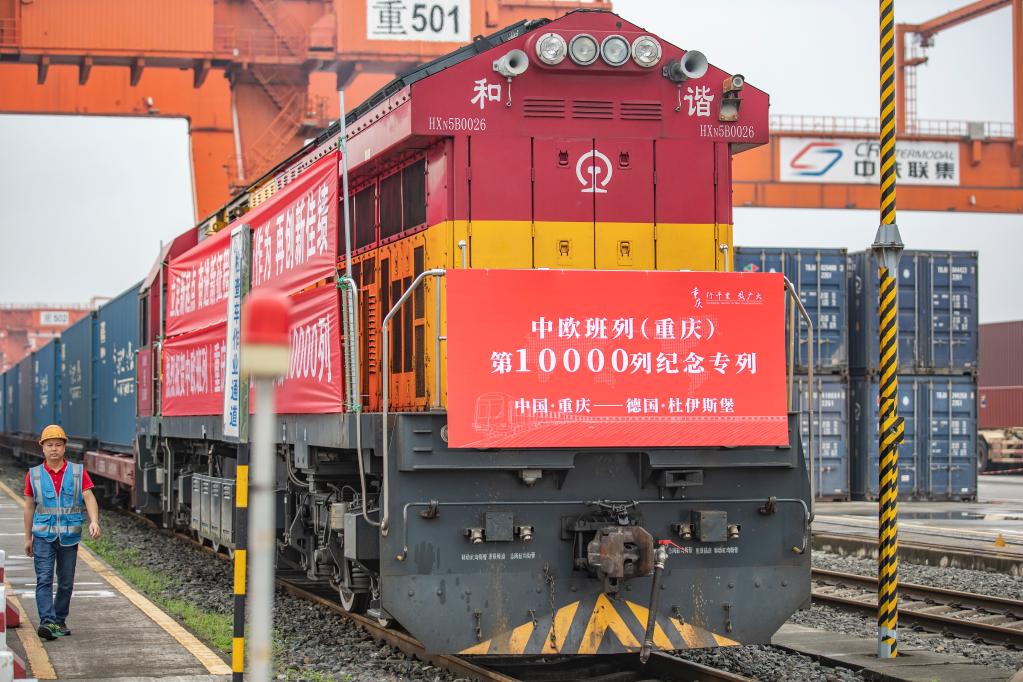 2022年6月23日,在重庆团结村中心站,铁路工作人员从中欧班列(重庆)第10000列列车旁走过。当日,第10000列中欧班列(重庆)从重庆团结村中心站顺利驶出,奔赴德国杜伊斯堡。(新华社记者黄伟摄)
