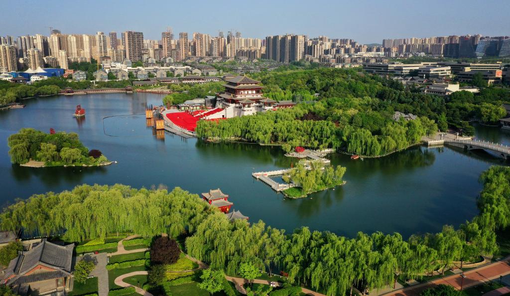 2023年4月25日的西安大唐芙蓉园(无人机照片)。新华社记者 刘潇 摄