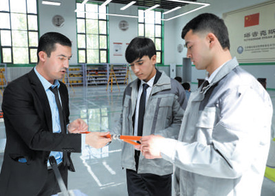在塔吉克斯坦首都杜尚别的鲁班工坊,塔方教授(左一)向学生讲解钢管焊接的相关知识。奥斯帕诺夫摄(新华社发)