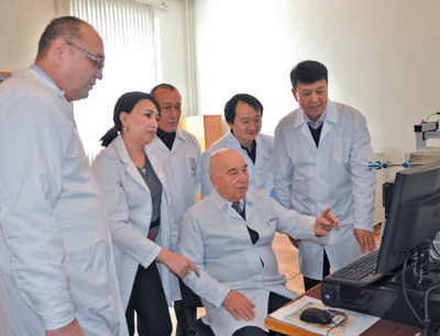 中国科学院中亚药物研发中心内,乌兹别克斯坦科学院前院长、中国科学院外籍院士肖开提·萨利霍夫(前)在指导实验。伊希莫夫摄