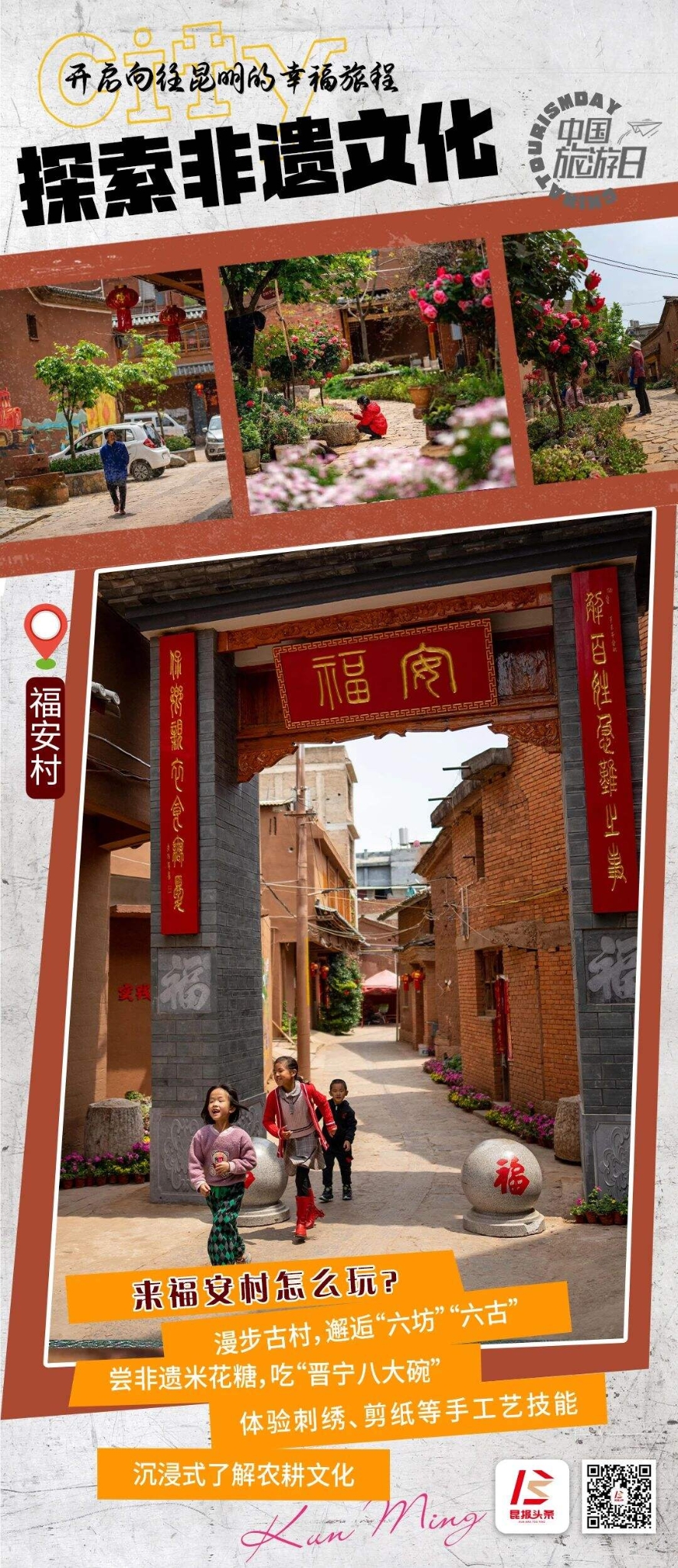 福安村位于滇池东南岸,形成于明代,村内保留有集中连片的古建筑和丰富的非物质文化遗产。通过打造“六坊六古”为主的“福安古村”品牌、突出非物质文化传承、深挖“老人老物件”故事等,福安村成了福村。经过翻修的古宅,古朴典雅;爬藤月季、百叶蔷薇等鲜花绿植,点缀着村巷,吸引了大量游客。