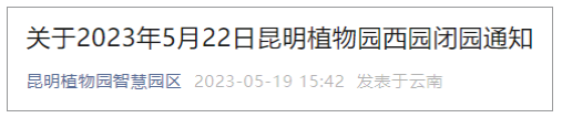 昆明植物园为筹备和保障“522国际生物多样性日”全球主场活动和COP15主席团会议重要接待,经研究决定,活动当天(2023年5月22日,星期一)西园闭园一天。