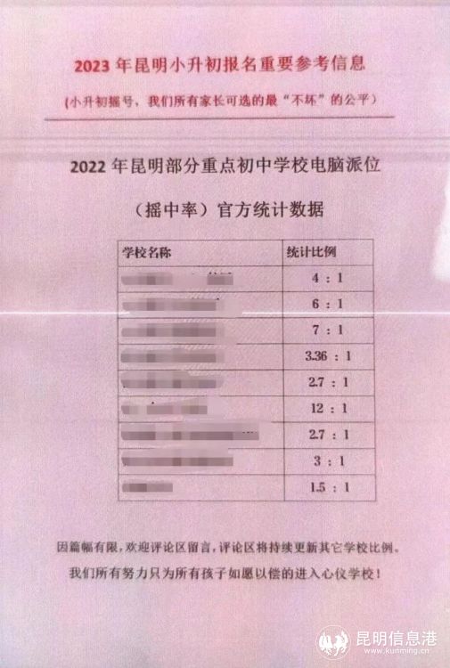 昆明信息港讯 记者合宇聪 记者从昆明市公安局获悉,4月30日,网民(抖音账号“谷耕课堂”)在抖音、今日头条短视频平台发布“最新官方统计昆明主城区民转公后各重点初中小升初电脑派位(摇号率)参考”并配图称“2022年昆明部分重点初中学校电脑派位(摇中率)官方统计数据”。消息发布后引起部分家长担心忧虑,纷纷到学校咨询,严重扰乱招生秩序。