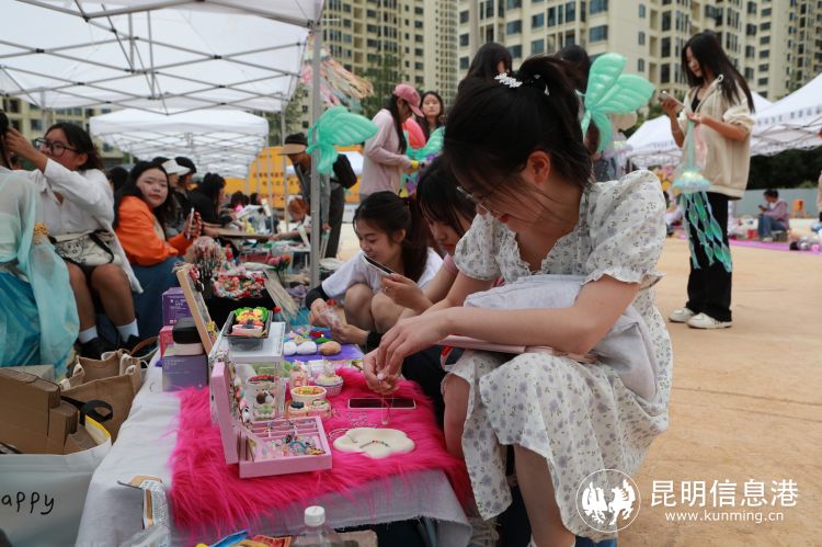 现场同时还布置了“花山市集”“青年创业市集”“大学生梦想市集”。集市摊位上有手工项链、手机壳等小玩意,也有陶瓷等彩绘商品,还有款式别致的蛋糕和饮品等食品。该市集汇集了百余件大学生的创意作品,打造了青年人的购物狂欢派对。