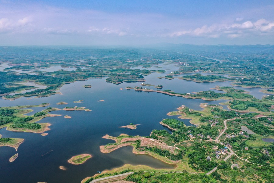 This aerial photo taken on May 16, 2023 shows the scenery of the Changshou Lake scenic area in southwest China's Chongqing Municipality. (Xinhua/Tang Yi)