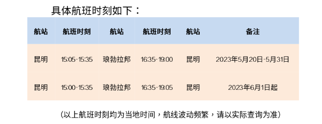 6月1日起,昆明=琅勃拉邦航线,航班时刻将进行调整,去程将于15:00自昆明起飞,15:35到达老挝琅勃拉邦;回程于16:35自琅勃拉邦起飞,19:05抵达昆明。航班进出港时刻均为当地时间。