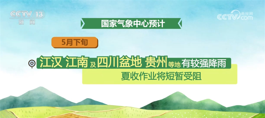 国家气象中心预计,5月下旬,北方冬麦区大部分时段以晴好天气为主,墒情适宜,利于冬小麦灌浆成熟;江汉、江南及四川盆地、贵州等地有较强降雨,夏收作业将短暂受阻;江淮大部天气较好,适宜夏收。