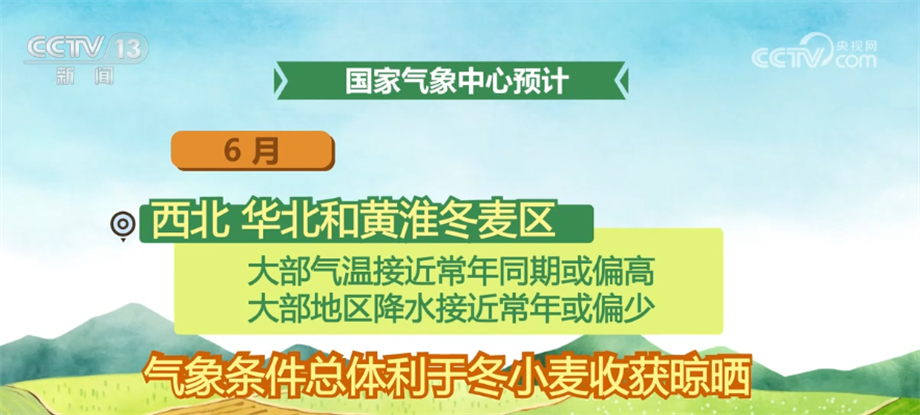 6月,西北、华北和黄淮冬麦区大部气温接近常年同期或偏高,大部地区降水接近常年或偏少,气象条件总体利于冬小麦收获晾晒;但山西西南部、陕西气温偏高,需关注干热风天气对小麦产量形成的不利影响,此外,气温偏高、降水偏少可能导致部分地区墒情偏差,不利于夏种。