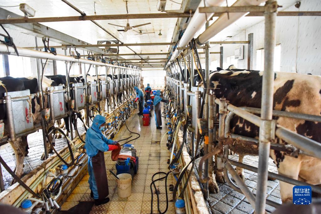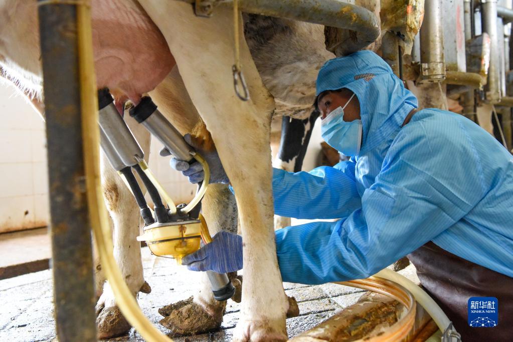 在新疆伊宁市巴彦岱镇奶牛养殖场,工人使用自动挤奶设备挤牛奶(5月19日摄)。