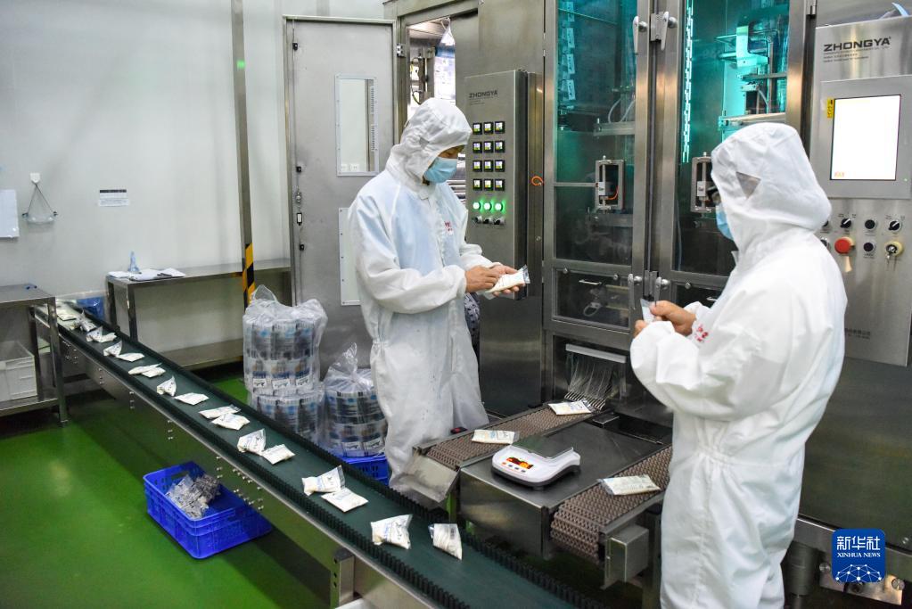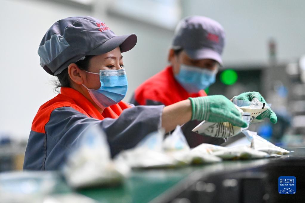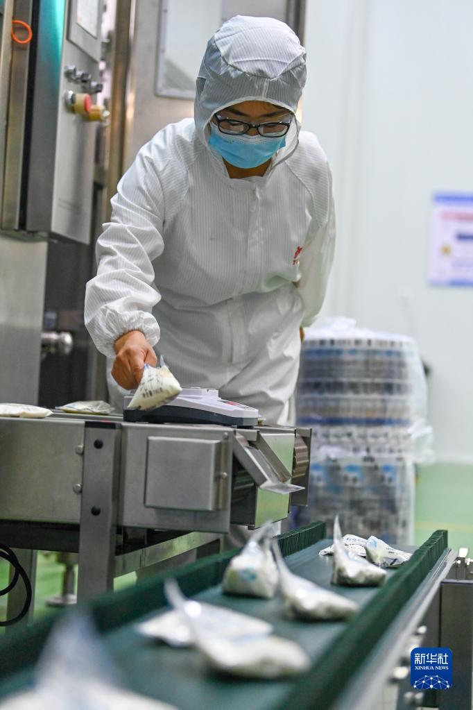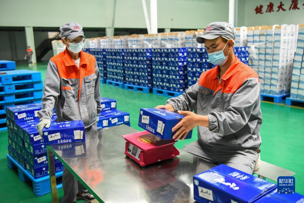 在位于新疆伊宁市的伊犁伊牧欣乳业有限公司,工人在包装车间忙碌(5月19日摄)。