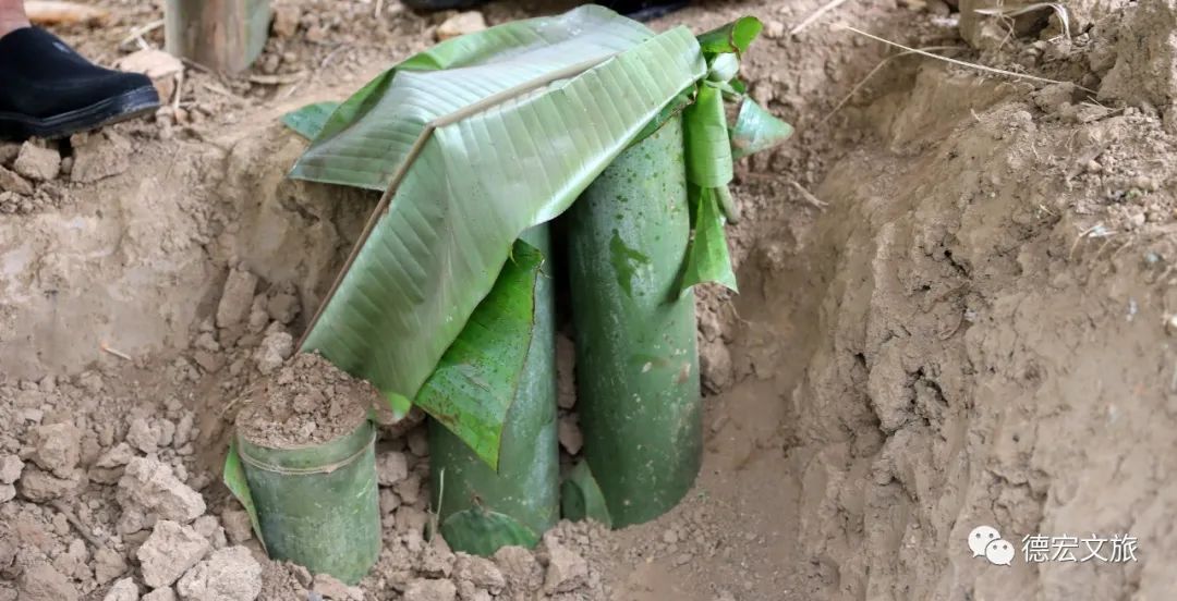 茶叶填满后,用新鲜芭蕉叶封口,选一处阴凉的地方挖一个深坑,垫上芭蕉叶,再将封好的竹筒埋起来,让茶叶在地下以纯天然的方式慢慢发酵。根据光照雨水的变化,大概需要30至50天。