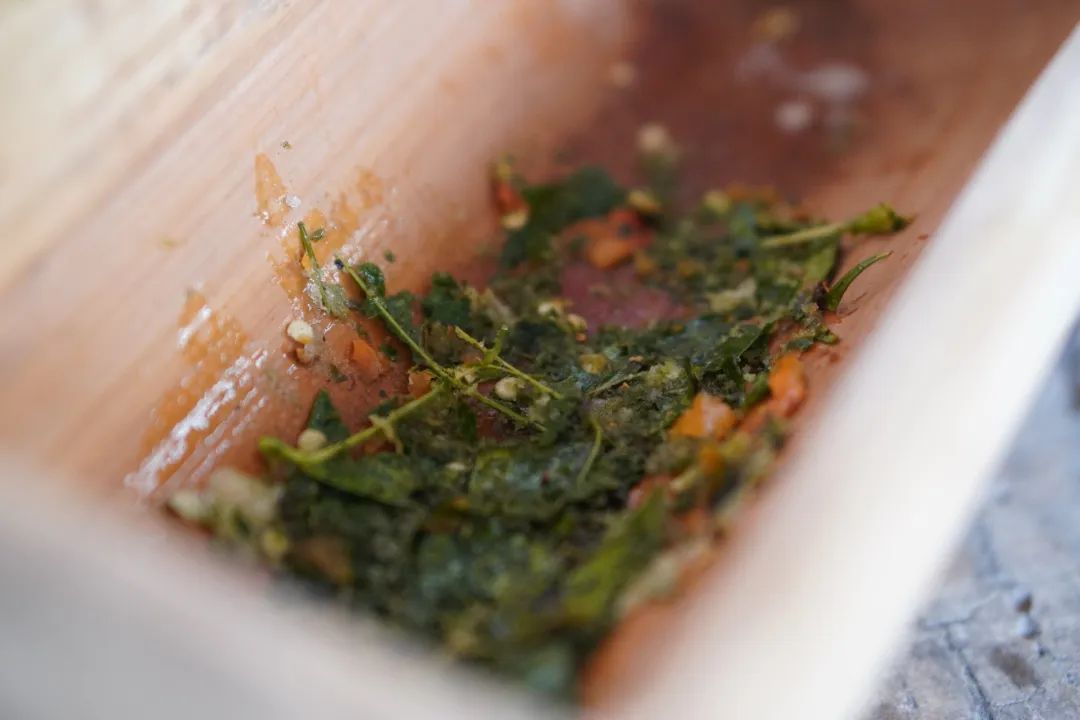 制作“凉拌茶”,只需将嫩茶叶、大蒜、野八角、辣椒、盐、柠檬叶、香叶等佐料与香料舂碎后,再放入茶叶舂碎,最后加入水,一道独具特色的基诺族“凉拌茶”便制作完成。茶汤鲜香,稍稍凑近,茶香便扑鼻而来。