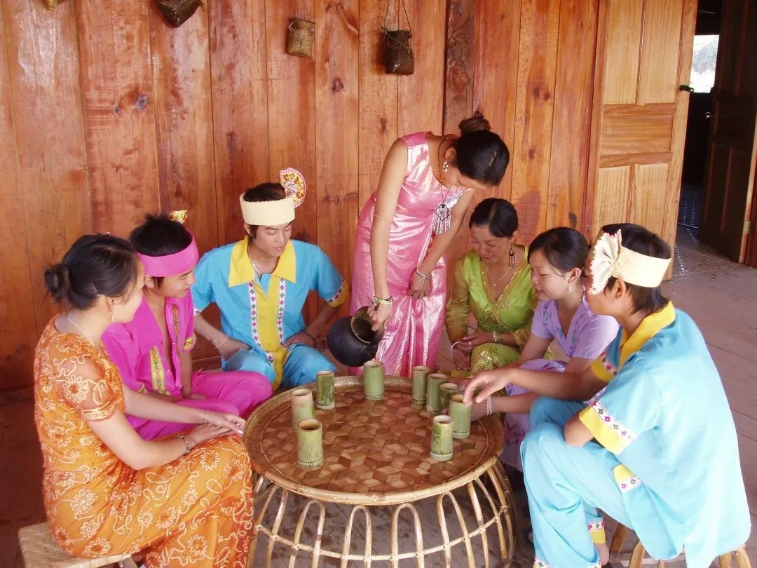 傣族喜欢饮用“竹筒茶”,“竹筒茶”在傣语里称为“腊跺”,是一种充满诗情画意的饮茶方式。将晒干的春茶放入刚砍回的香竹筒,放在火塘的三脚架上烘烤6—7分钟后竹筒内茶叶软化,用木樟将竹筒内茶叶舂压后再装进茶叶,随后边装、边烤、边舂,直至竹筒内茶叶填满舂紧为止。