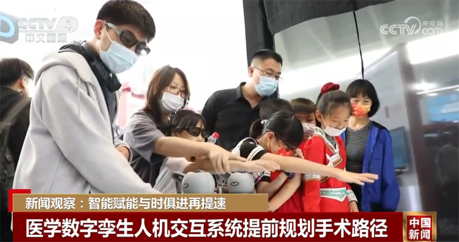 展会上,科研人员设计了一套基于全息现实的医学数字孪生人机交互系统,通过对患者数据进行建模,在投影的孪生人上生成血管、器官等重要组织结构,辅助医生进行手术的路径规划。