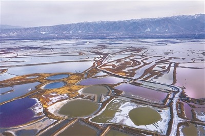 “盛夏时节,湖水不断蒸发浓缩,由于盐畦阡陌纵横,各个池中盐度、矿物质含量不同,加之杜氏盐藻在不同的盐度、光照、温度等环境下分别产生叶绿素、类胡萝卜素的特性,迅速繁殖的杜氏盐藻和以藻类为食的卤虫,把各个盐池染成了深浅不一的调色盘,造就了七彩斑斓的盐湖景观。”孙冬青说。
