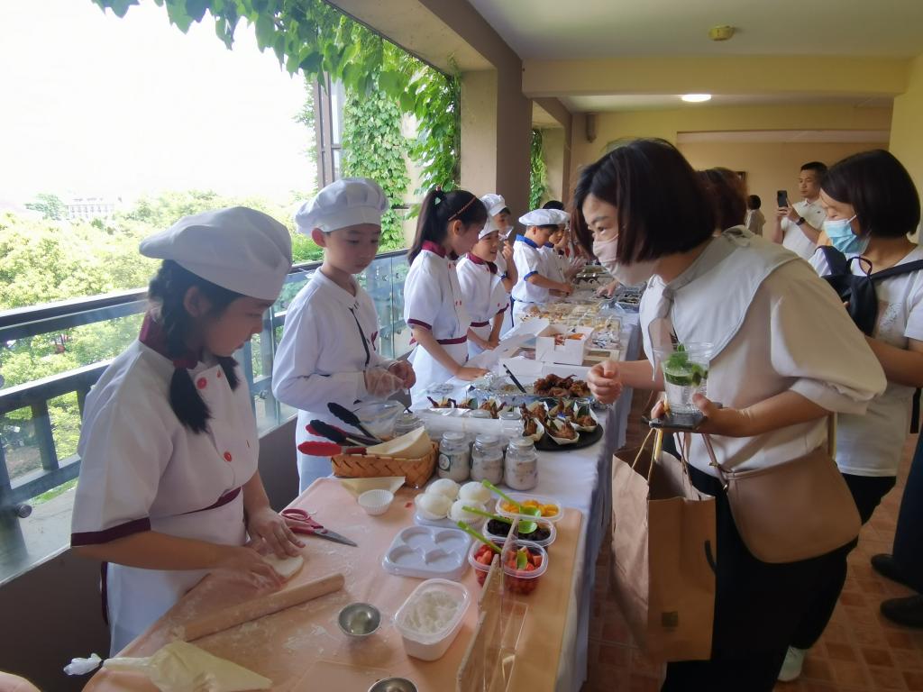 杭州一所小学的学生们在制作餐食现场展示自己的劳动成果。(资料图)