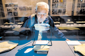 张世山在晋宁博物馆内查看一块由他提供的古生物化石。