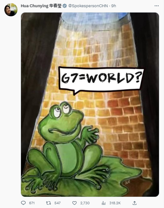 华春莹接着发了3张图,其中第一张图以“井底之蛙”为主题,上面的配文写道,“G7=世界?”↓