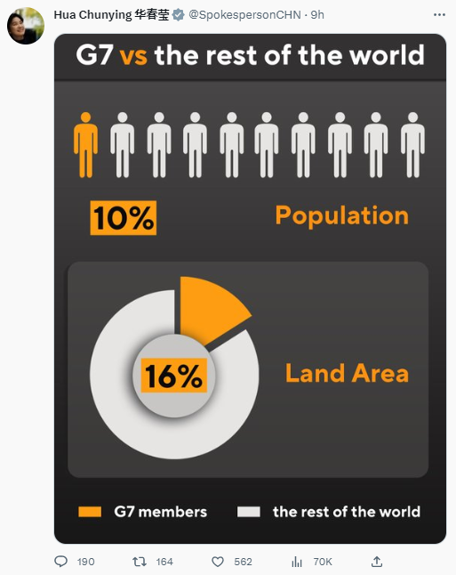 她在第二则帖子中说,“如果中国是一个‘威胁’,那么那些对主权国家发动战争、推翻他国合法政府、退出多边条约和胁迫他国切断供应链的G7成员国是什么?真实的世界不会被洗脑和欺骗”。↓