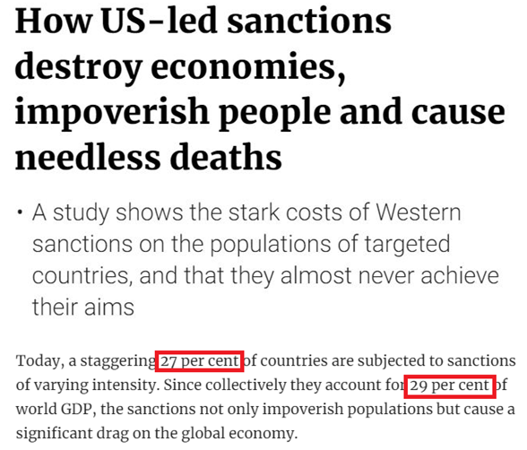 由于受制裁的国家和地区占世界生产总值的29%,制裁不仅使受害国民众陷入贫困,而且对全球经济造成严重拖累。