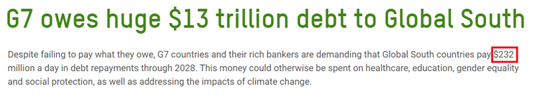 “是时候揭穿G7的虚伪了:它们企图逃避责任,维持新殖民主义的现状。”