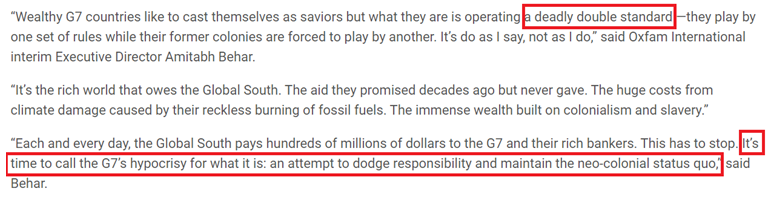 乐施会临时执行董事阿米塔布·贝哈尔批评说,G7国家总喜欢把自己塑造成“救世主”,但它们实际上一直在执行致命的双重标准。