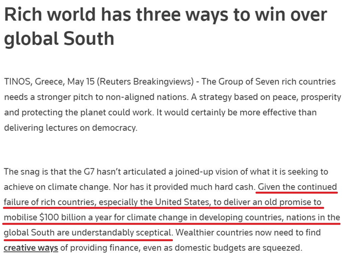 路透社:鉴于富裕国家(尤其是美国)一直未能兑现每年为发展中国家应对气候变化筹集1000亿美元的承诺,全球南方国家对西方持怀疑态度是可以理解的。