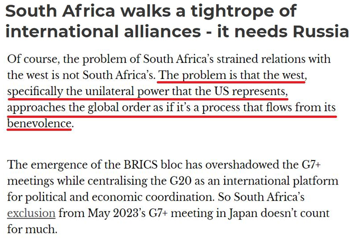 原因很简单:南非一直以来在乌克兰危机等国际问题上的独立自主立场犯了美西方的忌;而不久前,由美国驻南非大使无端指称南非“秘密向俄罗斯提供武器”引发的外交风波也让南非与美西方愈行愈远。