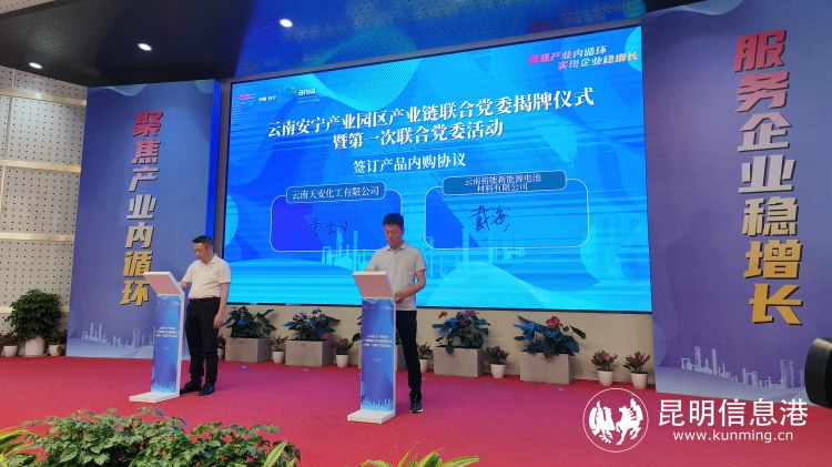 揭牌仪式上,云南云天化石化有限公司、云南友日久包装实业有限公司等8家产业链上企业签订产品内购协议,中国工商银行安宁支行、中国建设银行昆明安宁支行、安宁市农村信用合作联社分别与产业链上3家企业签订金融服务协议。云南云天化石化有限公司代表产业链联合党委企业发言。