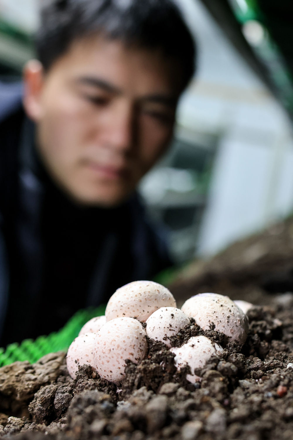 工作人员在贵阳市白云区食用菌产业示范园智能菇房内查看菌菇生长情况(2022年2月14日摄)。新华社记者 欧东衢 摄