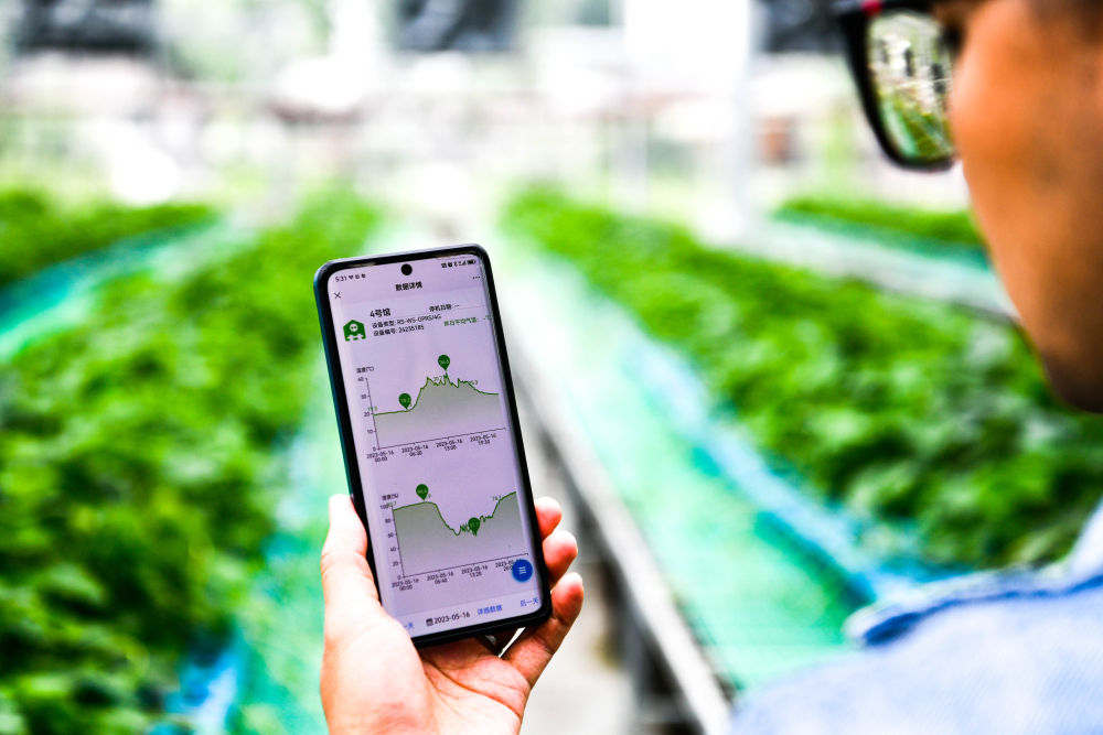 农技人员在贵阳市开阳县南江蔬菜良种繁育中心展示手机“惠农云助手”上育苗大棚内温湿度的记录(2023年5月23日摄)。新华社记者 杨文斌 摄