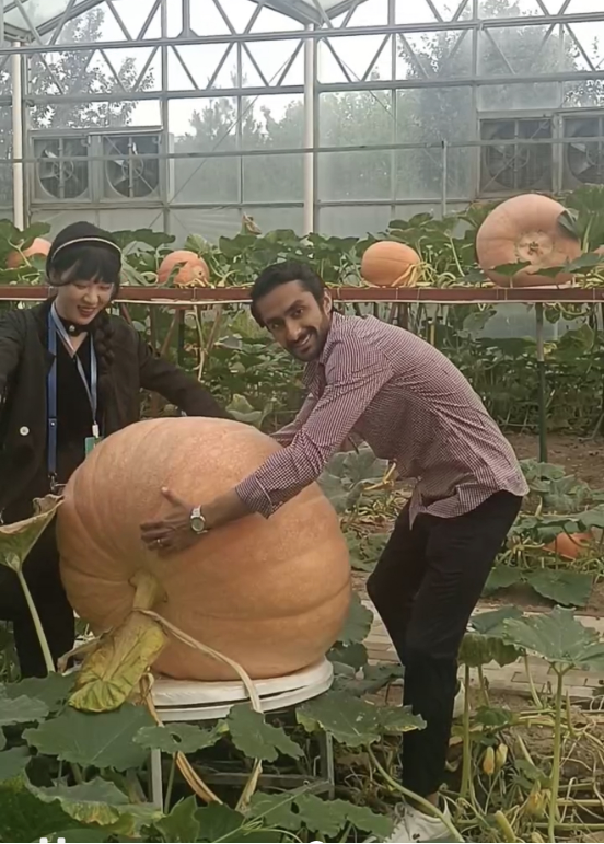 最让人震惊的就是巨型南瓜,重达3、4百斤,好像童话《灰姑娘》里的“南瓜马车”,引得巴基斯坦记者忍不住伸手去抱一抱。