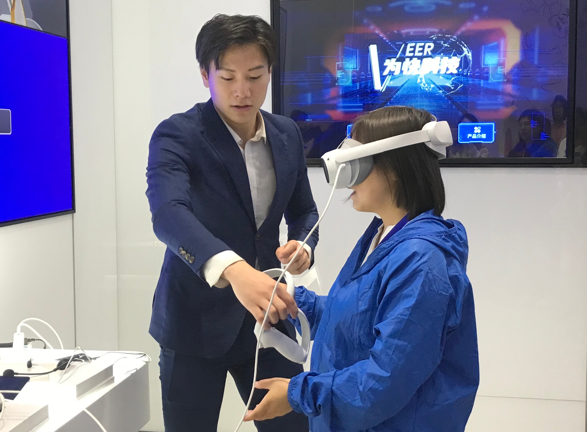 讲解员在指导记者操作相关设备。记者石嘉欣/摄