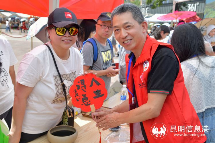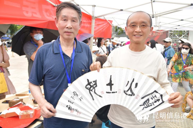 午后的骄阳下,由昆明知名书画家组成的文艺志愿服务队,在现场为路过群众挥毫作画。活动开始之初,便吸引了大量群众围观,从老人到小孩,全年龄段的群众纷纷围聚在活动现场,在赞叹艺术家们艺术造诣的同时,还领到了自己中意的书画作品。